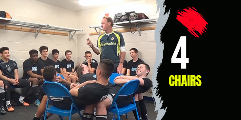 This is a fun team building exercise you can do in the locker room using 4 chairs. The lesson is that each player is dependent upon one another, and no player is greater than the "Team". Start the exercise by placing 4 chairs in the center of the locker room. Have each person slowly lean backwards into the lap of the person behind them. Once they are sitting, have each player lay back on the other players thighs